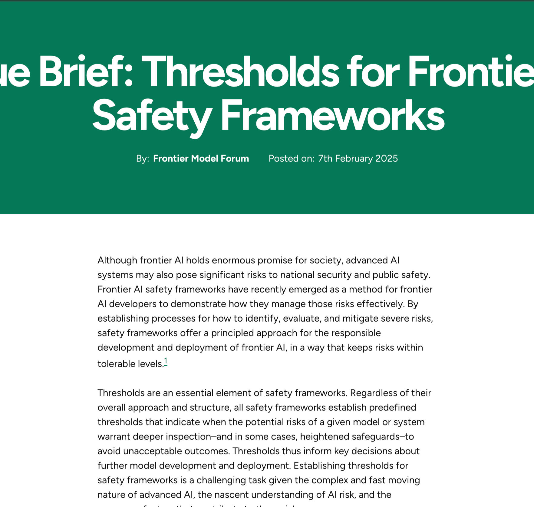 Zaheed Kara (2025), for the Frontier Model ForumThis issue brief seeks to advance and inform public understanding of frontier AI thresholds. Drawing on insights from experts within the FMF as well as the broader AI safety and security community, this brief elaborates on the importance of thresholds for frontier AI safety frameworks and outlines the different types of thresholds that have been proposed.