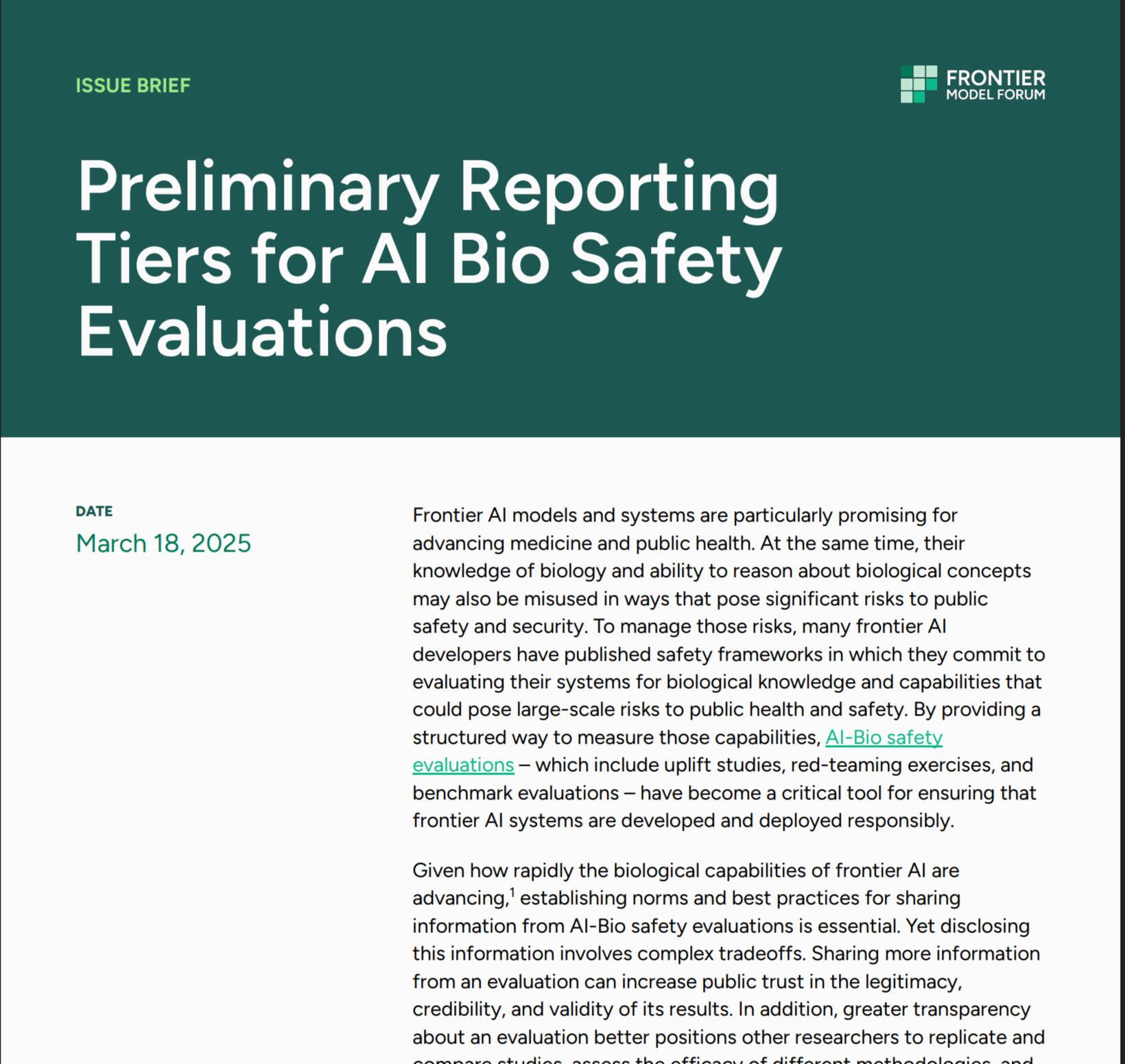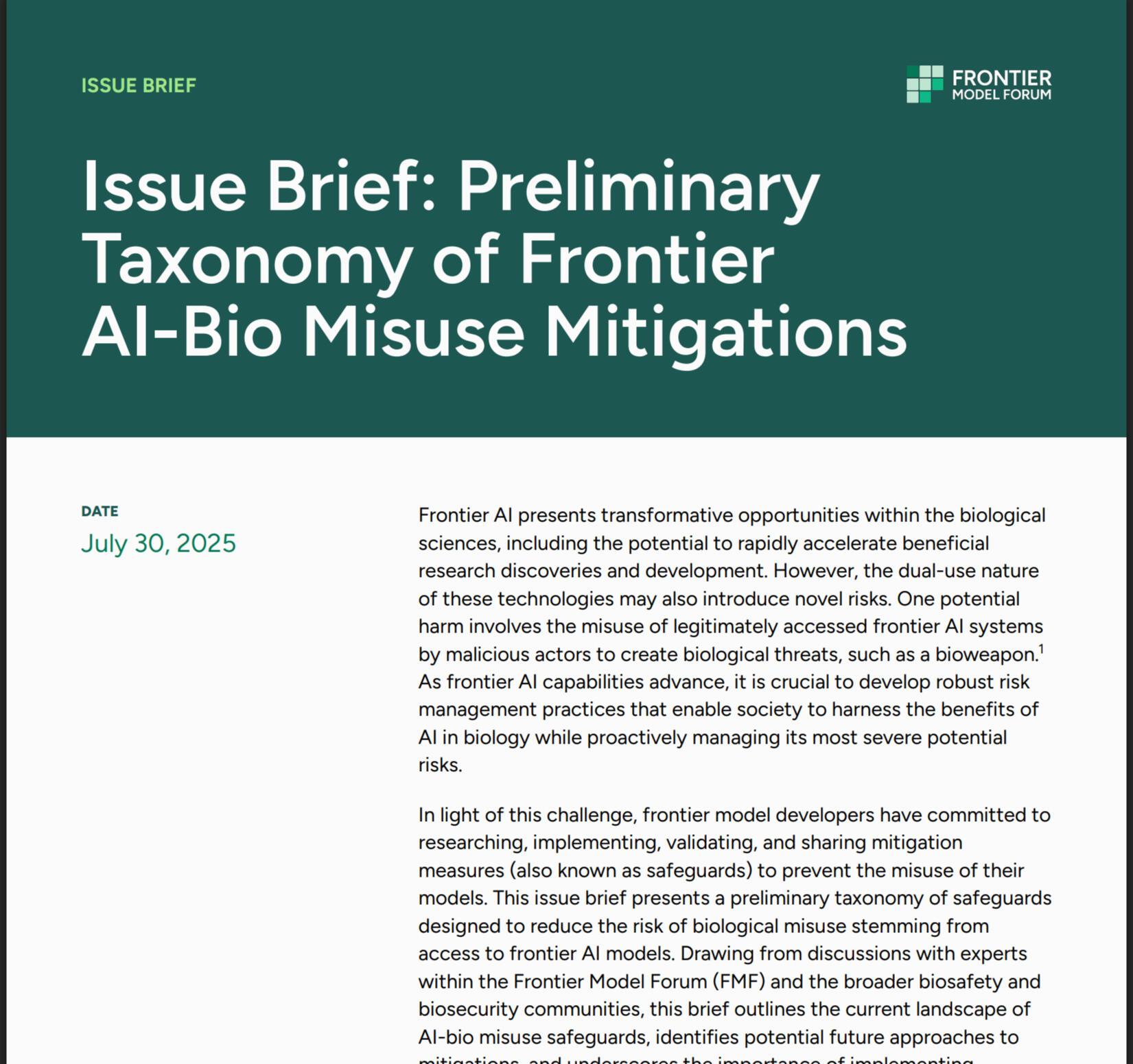 Zaheed Kara (2025), for the Frontier Model ForumThis issue brief presents a preliminary taxonomy of safeguards designed to reduce the risk of biological misuse stemming from access to frontier AI models. Drawing from discussions with experts within the Frontier Model Forum (FMF) and the broader biosafety and biosecurity communities, this brief outlines the current landscape of AI-bio misuse safeguards, identifies potential future approaches to mitigations, and underscores the importance of implementing societal-level measures as a complement to technical safeguards.