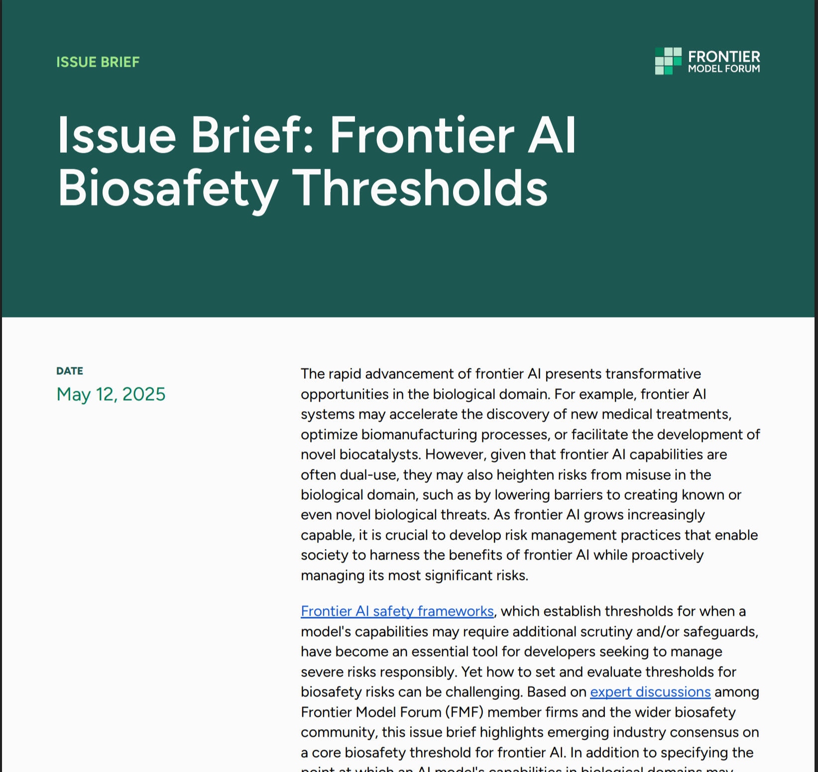 Zaheed Kara (2025), for the Frontier Model ForumBased on expert discussions among Frontier Model Forum (FMF) member firms and the wider biosafety community, this issue brief highlights emerging industry consensus on a core biosafety threshold for frontier AI. In addition to specifying the point at which an AI model’s capabilities in biological domains may require further assessments and/or enhanced safeguards, it also provides initial guidance for evidence-based threshold determinations.