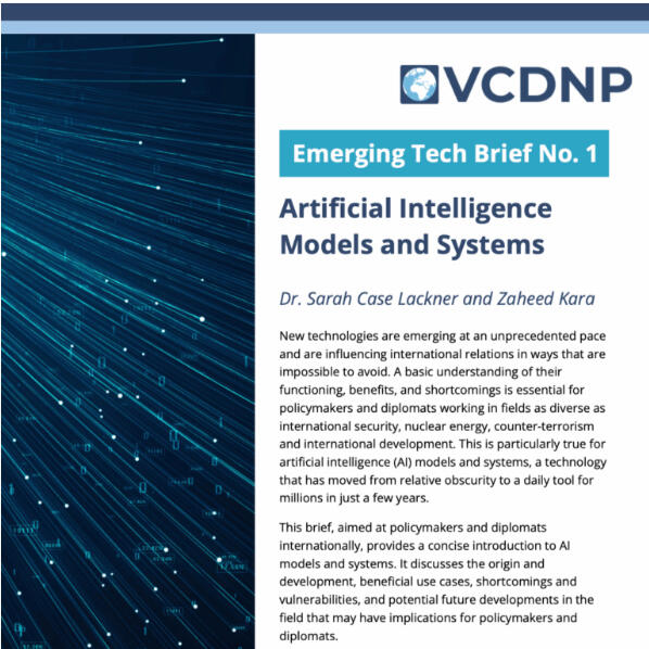 Dr. Sarah Case Lackner & Zaheed Kara (2025)Aimed at policymakers and diplomats focused on nuclear security, this brief provides a concise introduction to AI models and systems. It discusses the origin and development, beneficial use cases, shortcomings and vulnerabilities, and potential future developments in the field that may have implications for policymakers and diplomats.