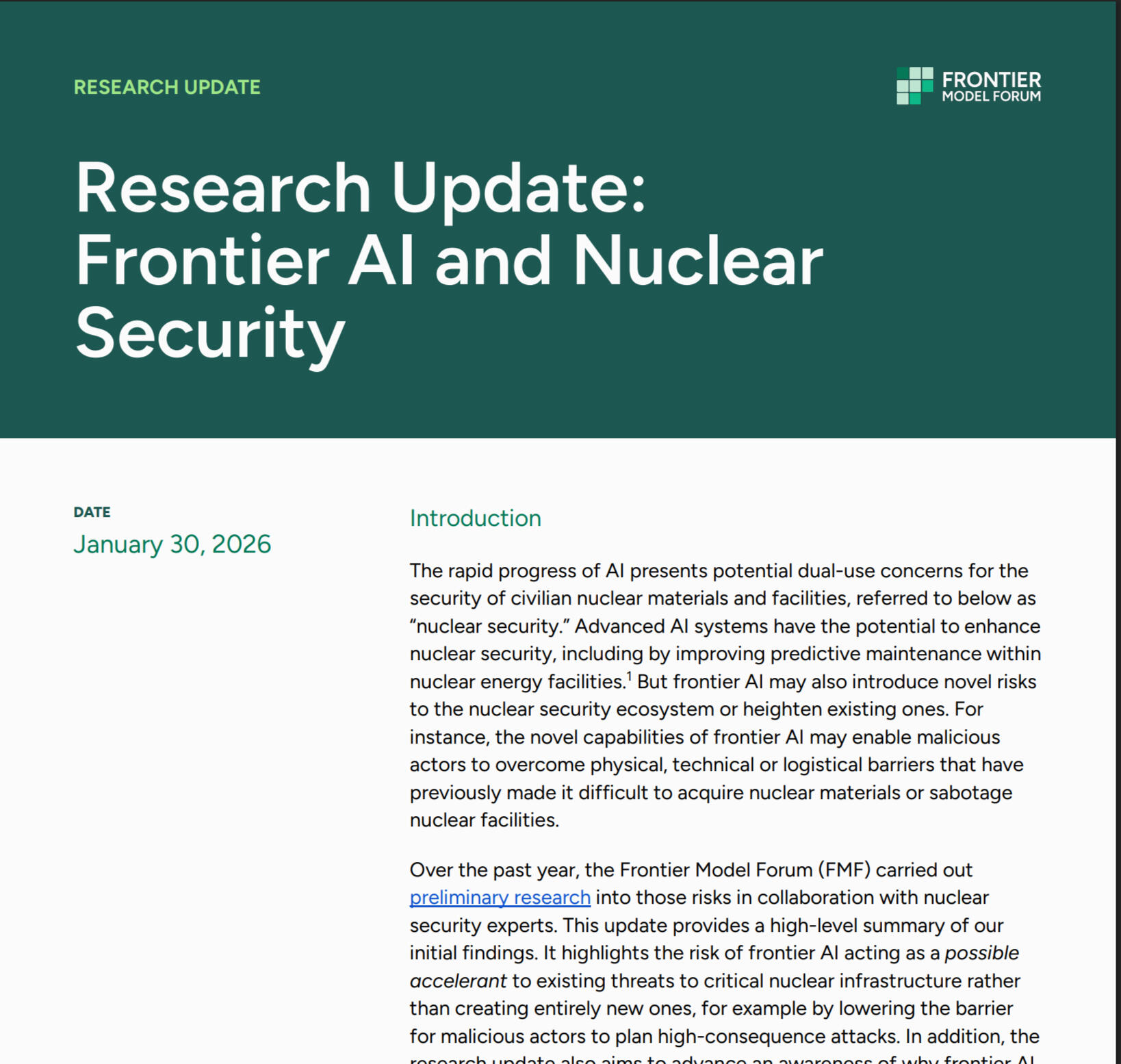 Zaheed Kara (2026), for the Frontier Model ForumBased on extensive engagement with the nuclear security community, this research update aims to inform greater understanding of those risks and establish a foundation for future collaboration on frontier AI risk management between the frontier AI and nuclear security communities.